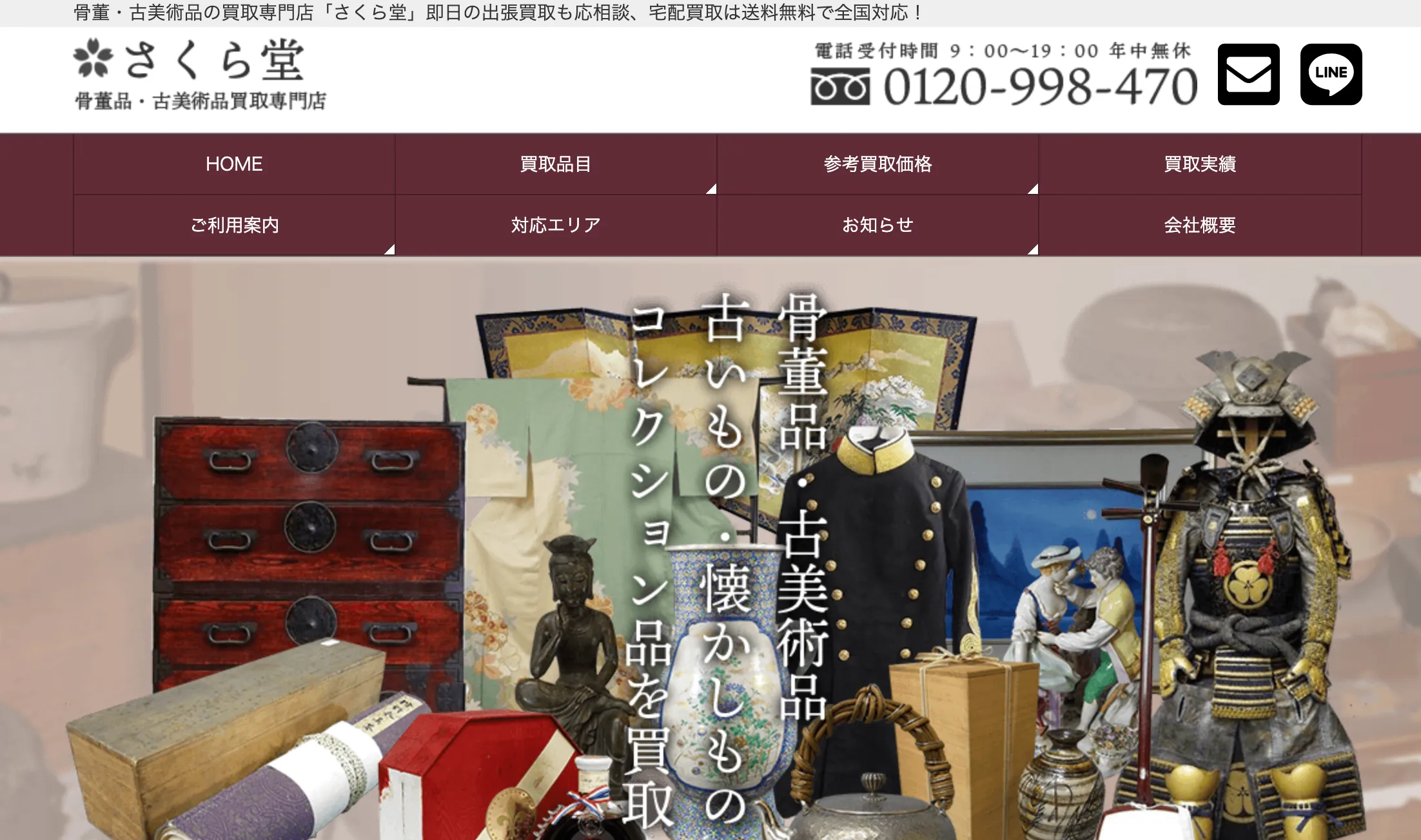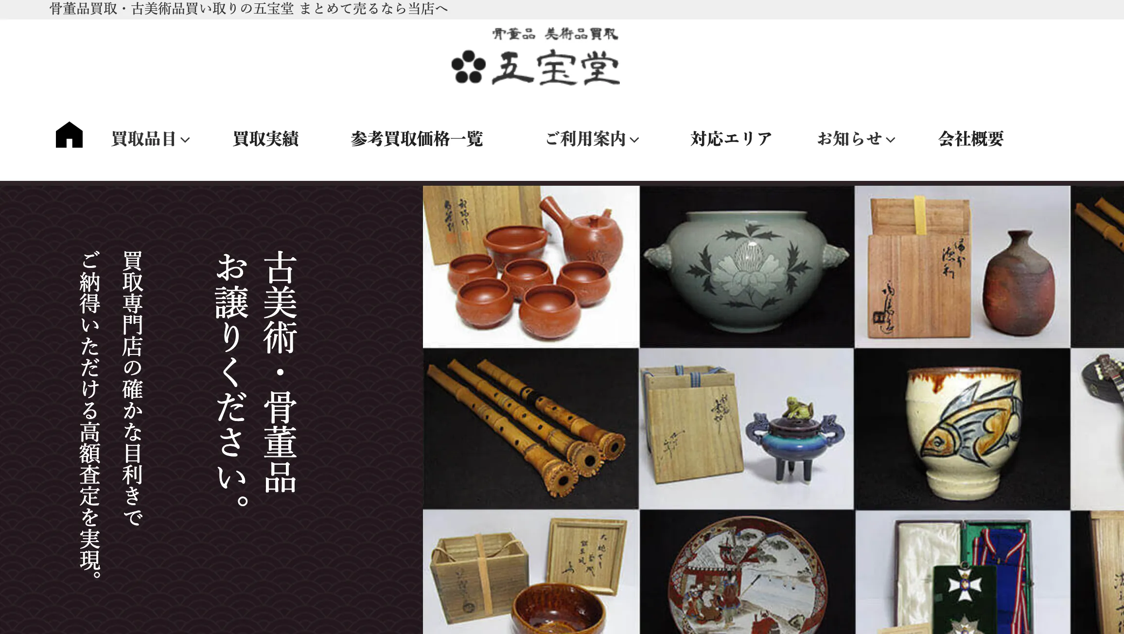 買取品目陶磁器(古伊万里、九谷焼、備前焼、有田焼など)、絵画・掛け軸・日本画・洋画、茶道具(茶碗、茶釜、茶杓、棗など)、仏像・仏教美術品、刀剣・武具・甲冑、古銭・記念硬貨・古紙幣、彫刻・ブロンズ像・木彫り、蒔絵・漆器、古書・古文書・浮世絵、アンティーク家具、金・銀製の骨董品、その他古美術品全般