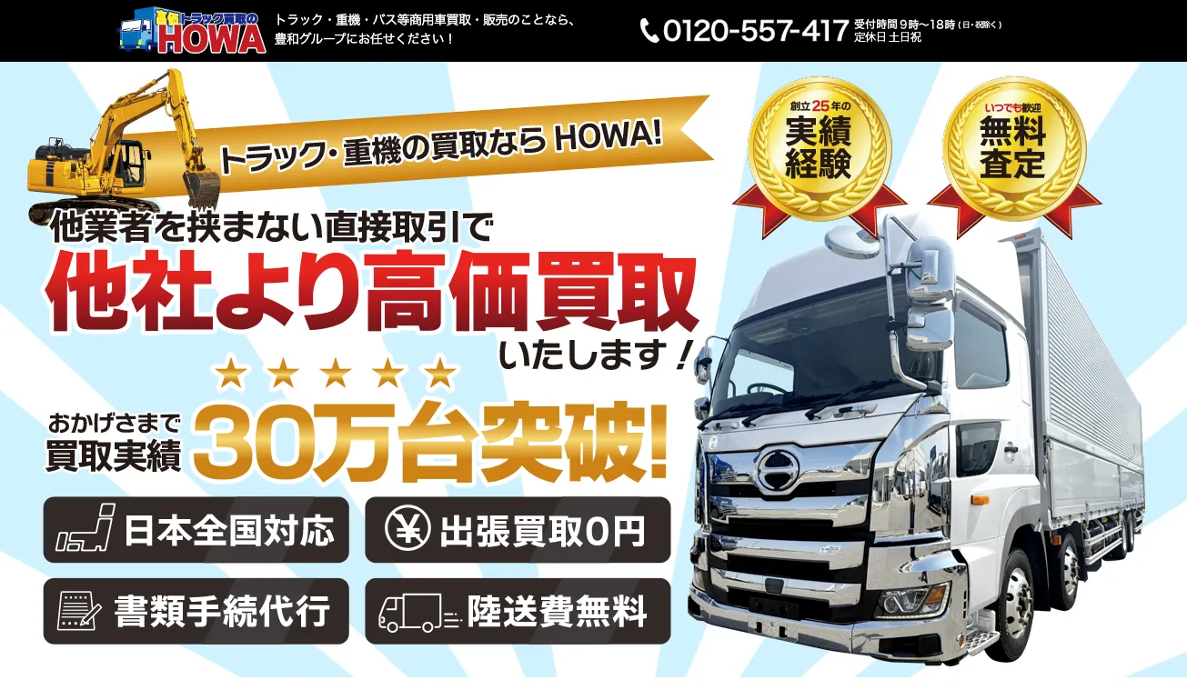 トラックファイブは、中古トラック・バス・重機などの商用車に特化した買取専門店で、全国対応の出張査定が強み。